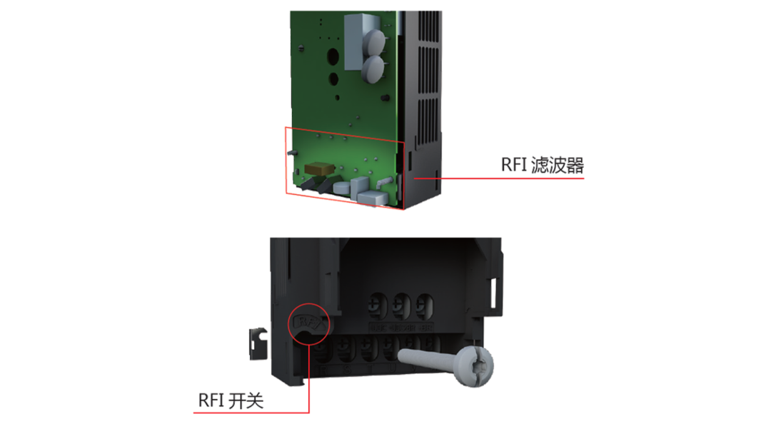 全系內置C3等級的RFI濾波器(可通過RFI開關選擇是否連接),可以減小電磁干擾,使變頻器EMC性能達到二類環境(工業環境)不受限制使用。