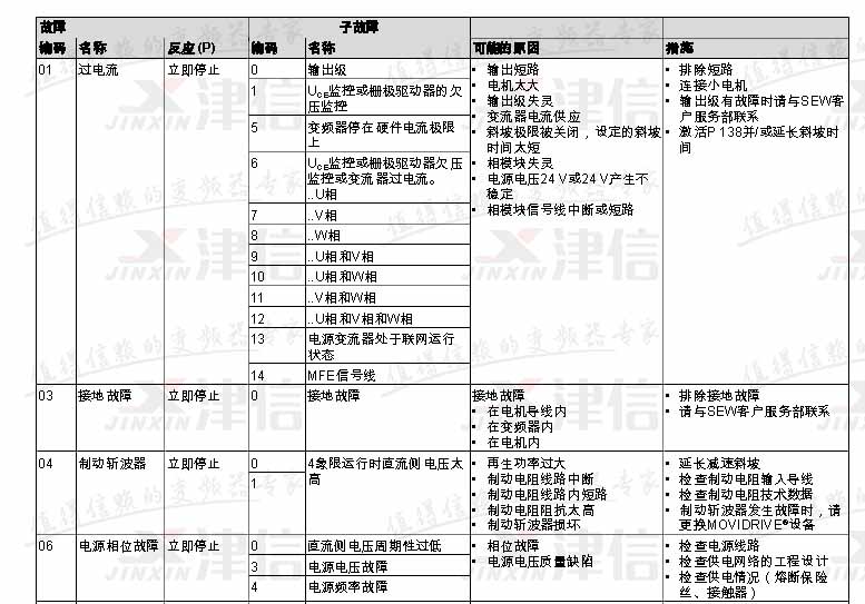 SEW變頻器故障代碼,包括主故障代碼和子故障代碼,下表是F01,F03,F04,F06故障的相關內容: